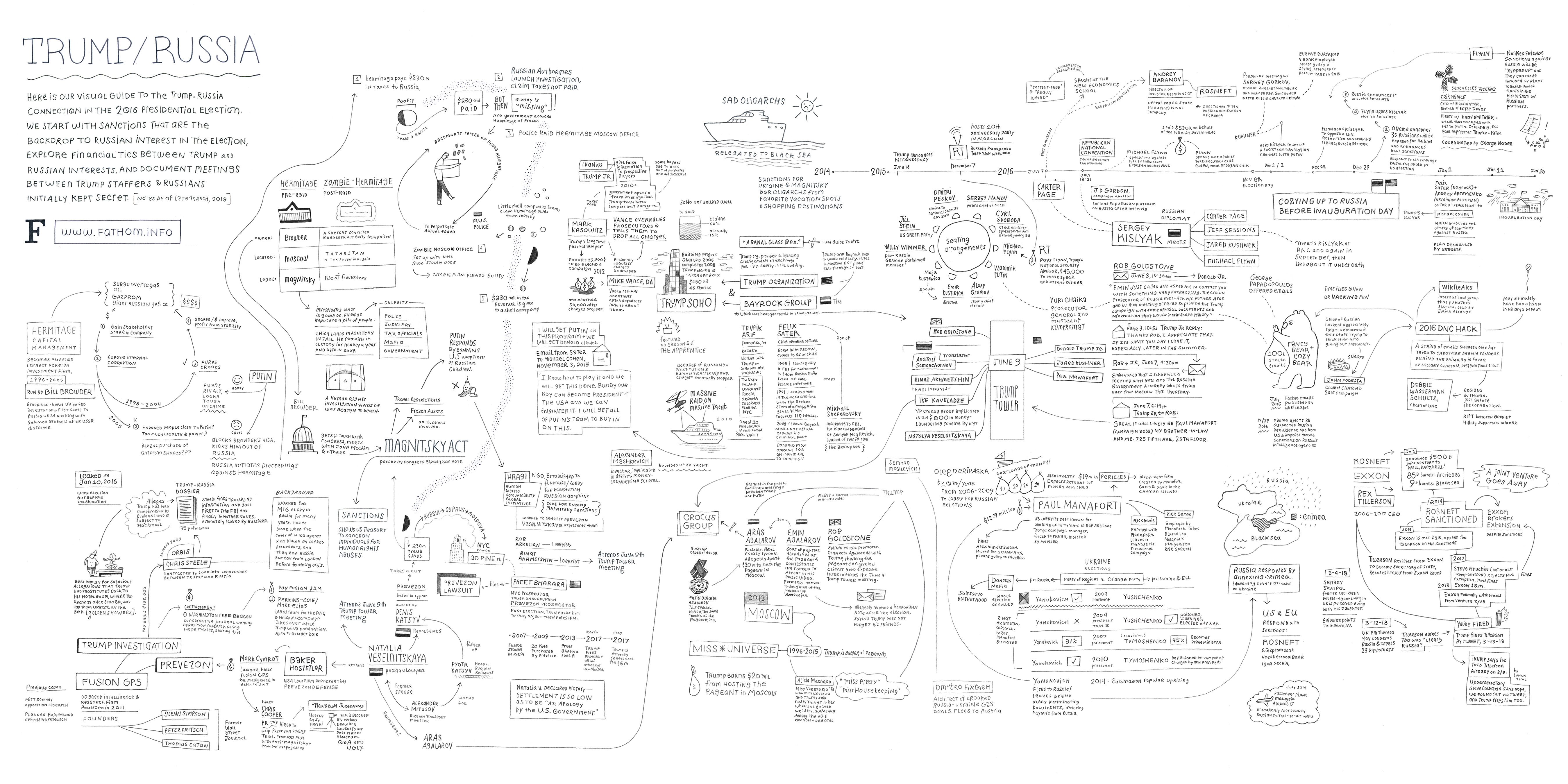 Recently, we’ve been building prototypes that depict entities, relationships, and dates in large document sets. Heading down the rabbit hole of Glenn Simpson’s Senate testimony, we soon found ourselves digging through the data on Trump-Russia connections. Moving between code, the whiteboard, and hand sketching, we mapped the known relationships, business deals, and meetings between Trump staffers and Russian interests—as of March 23, 2018. Read more about it here, or go straight to the full poster image here.