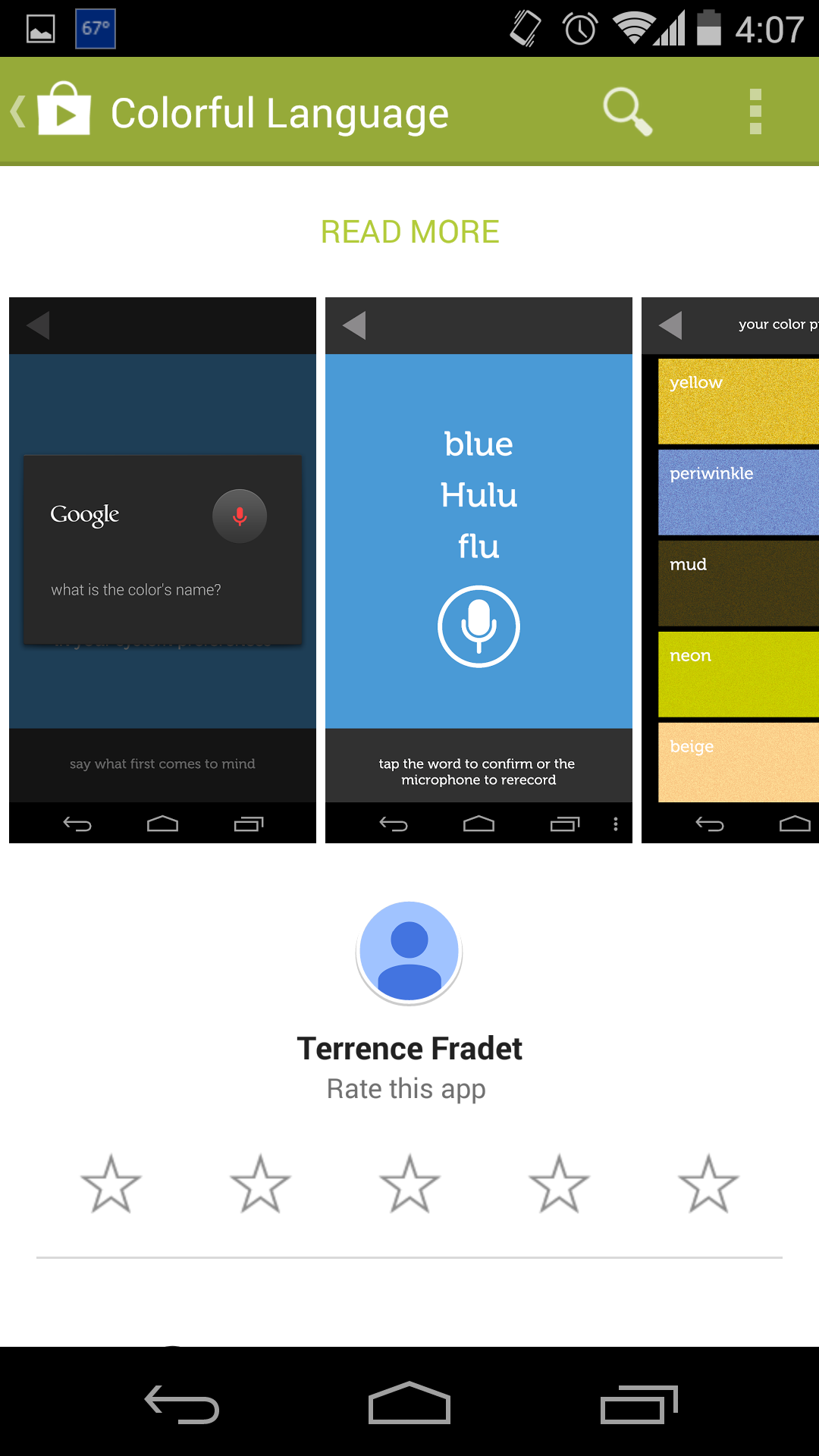 We chose to implement the survey using Android's built-in speech recognition. Speaking your responses makes the survey easier to complete, and it doesn't limit users to those who know how to spell. It is also closer to how the original WCS was administered, verbally and in person. Besides, it's fun to make people think you're crazy when you're on the train enthusiastically shouting colors into your phone.